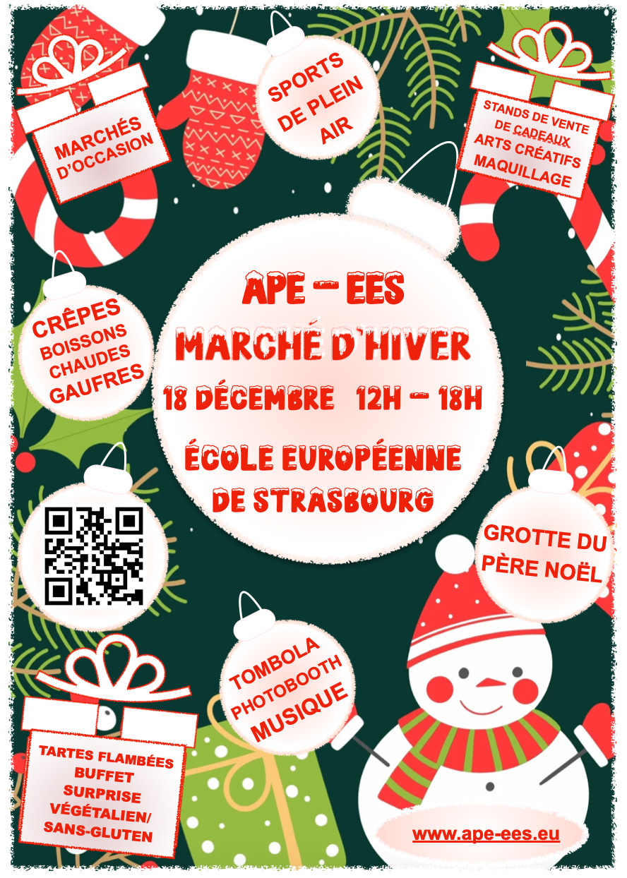 We will also have many stalls offering GIFTS (home made/ ecological), ARTS & CRAFTS, FACE PAINTING, LIVE festive MUSIC, a PHOTOBOOTH, a TOMBOLA, SPORTS Activities & CRÊPES/ WAFFLES offered by our SPORTEES team, in aid of the charity SECOURS POPULAIRE …. as well as SANTA CLAUS, ready for photos in his GROTTO, freshly made TARTE FLAMBÉE, a VEGAN/ GLUTEN FREE Food Truck and our INTERNATIONAL FOOD BUFFET.